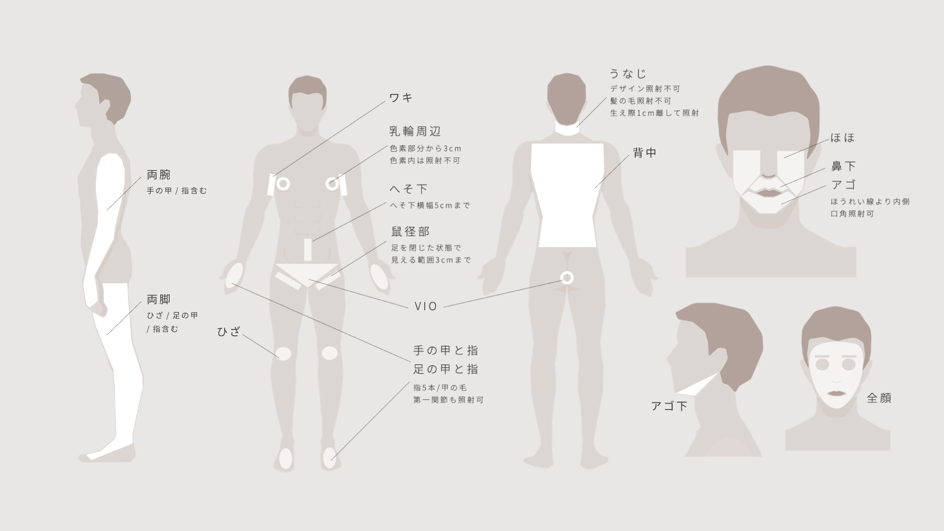 右記から3部位 鼻下/アゴ/アゴ下/乳輪周辺/へそ下/鼠径部/ひざ/足の甲と指/手の甲と指
